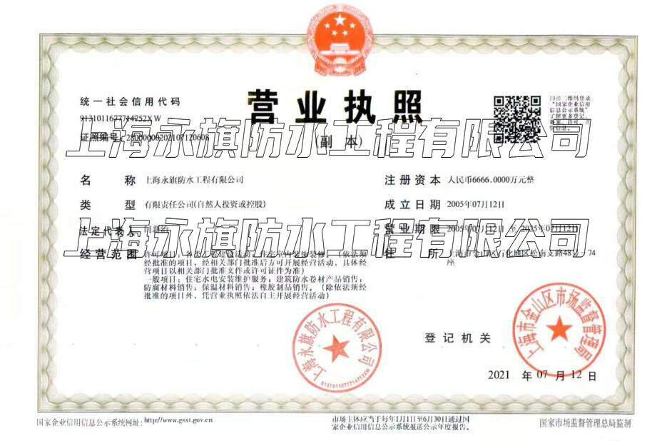 上海永旗防水工程有限公司位于中國大城市,魔都上海,上海市寶山區(qū)逸仙路2816號1幢9層,于 2005年07月12日注冊成立,注冊資本為6666萬人民幣,在公司發(fā)展壯大的近二十年里, 我們始終為客戶提供好的產品和技術支持、健全的售后服務。